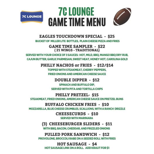 Catch the Eagles game at 7C Lounge and make it a full game-day experience with our Game Time Menu. Grab the Eagles Touchdown Special for $25 (bucket of Miller Lite bottles, plain cheese pizza, and fries) or share the Game Time Sampler for $22 with 21 traditional wings and your choice of sauces. Fans also […]