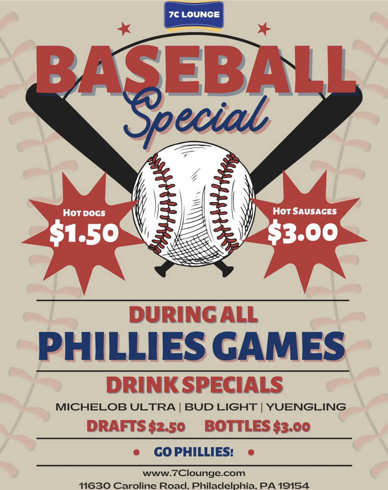 Cheer on the Phillies at 7C Lounge and enjoy our Baseball Specials during every game: $1.50 hot dogs, $3 hot sausages, plus drink specials on Michelob Ultra, Bud Light, and Yuengling with drafts $2.50 and bottles $3.00. Bring the crew, grab a seat, and watch every pitch with us at 11630 Caroline Road, Philadelphia, PA […]